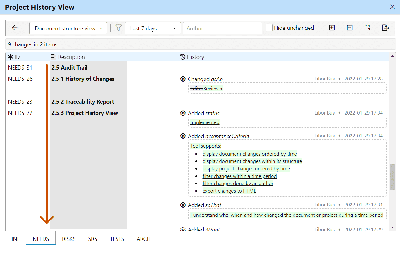Let’s assume that our software development project stores high-level user stories in a NEEDS document, SW requirements in a SRS document, and that SRS requirements are linked by satisfaction links to the corresponding high-level NEEDS. See also the Example Project.