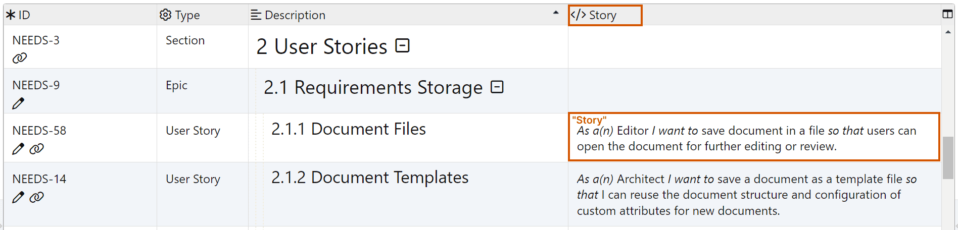 Display of template column Story for the source document in ReqView: