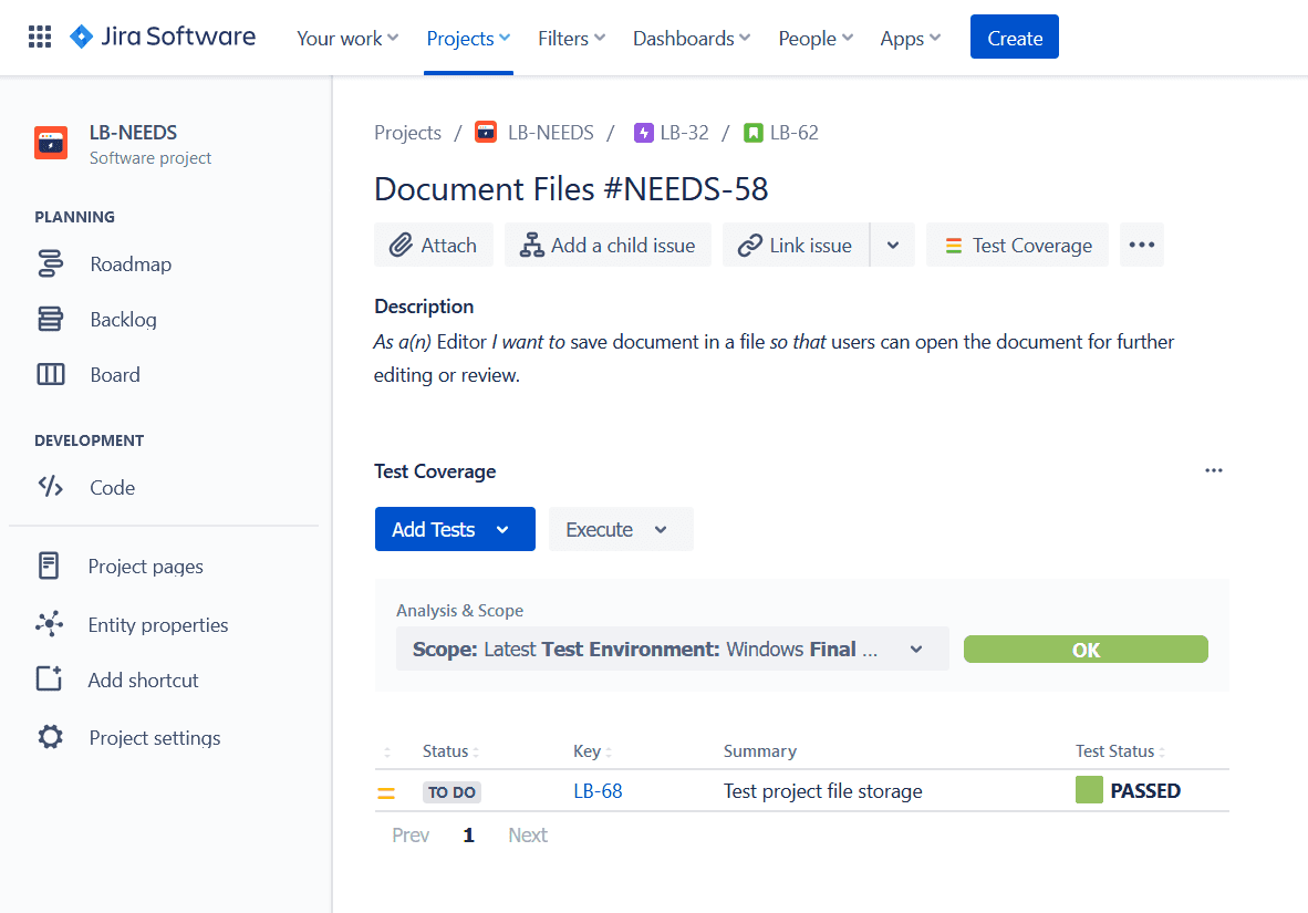 With these Jira plugins, you describe test cases as Jira work items of type Test providing information about tests steps, such as the action, test data, and expected results. Then, you link Test work items to Story work items to trace verified requirements. Finally, create test plans to schedule execution test cases, execute test plans, capture test results, and create defects describing found anomalies for each failed test.
