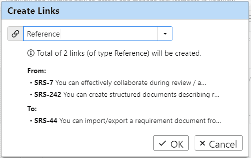 In the Create Links dialog, select a link type and review the traceability links between all source and target object pairs to be created.